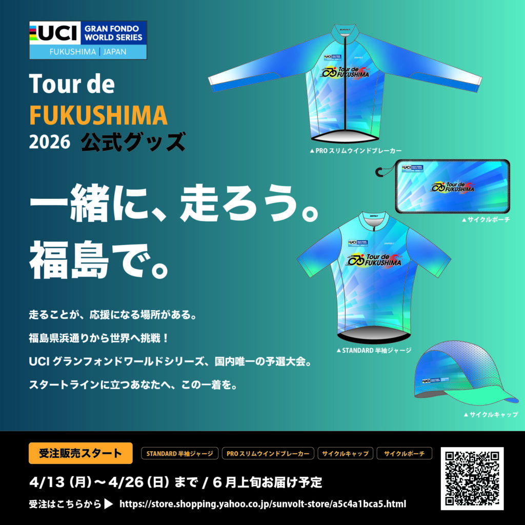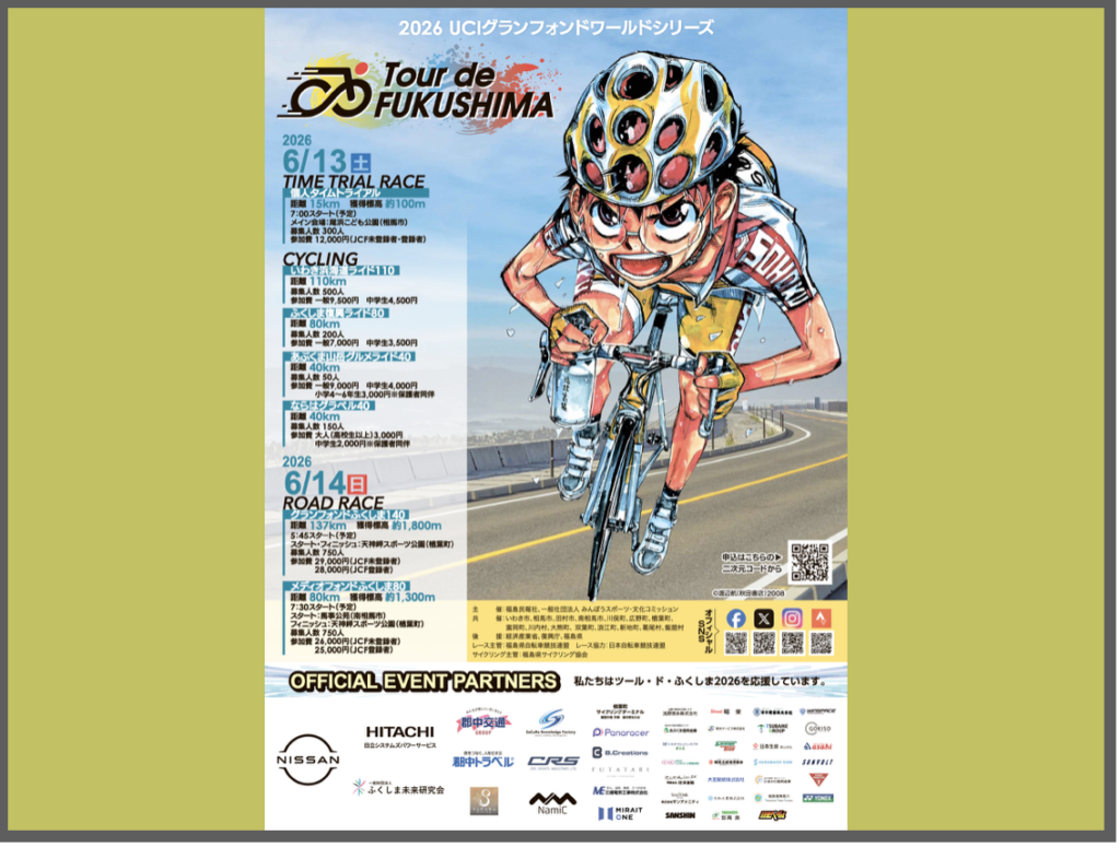 ツール・ド・ふくしまは4年目となる2026年、UCIグランフォンドワールドシリーズと位置づけられました。避難指示が解除されたばかりの被災地を駆け抜け、爽やかな浜風から福島復興の今を感じ取っていただきたい。