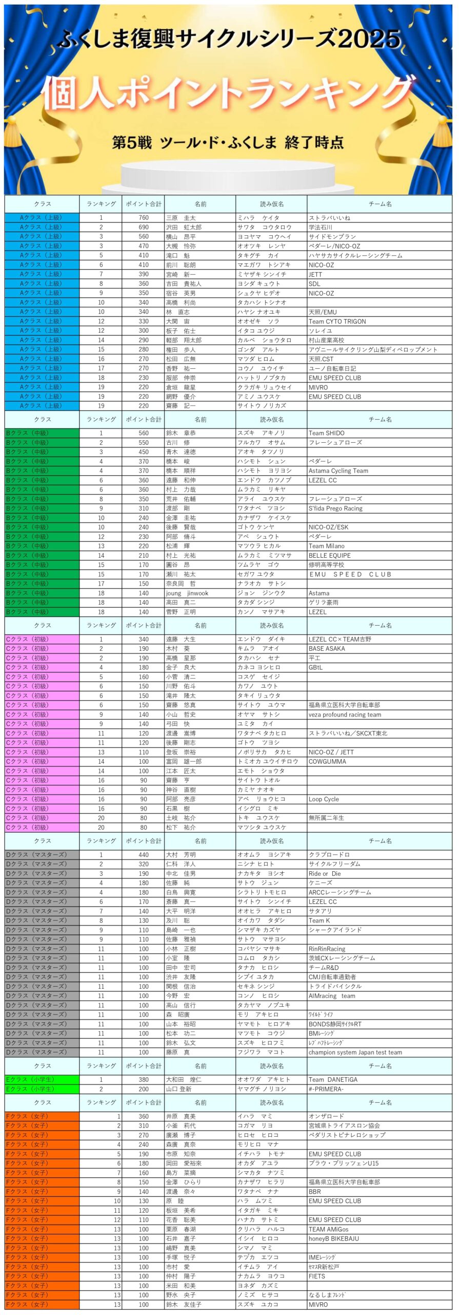 第5戦「ツール・ド・ふくしま」(上記5大会のポイント反映済み)