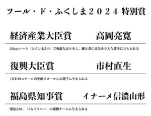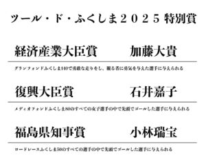 RESULTリザルト2026 ツール・ド・ふくしま2026(2026.6.13-14) ▶︎大会終了後掲載 ツール・ド・ふくしま2025(2025.9.7) ▶︎こちら ツール・ド・ふくしま2024(2025.9.14-15) ▶︎Day1 こちら ▶︎Day2 こちら 2026レース情報 2026.04.19 [予定] ツール・ド・かつらお 近日詳細公開 2026.06.13-14 [予定] ツール・ド・ふくしま 近日詳細公開 2026.06.13 [予定] ツール・ド・ふくしまサイクリング 近日詳細公開 2026.09. [予定] 裏磐梯スカイバレーヒルクライム大会 近日詳細公開 GALLERYギャラリー AREA INFO開催エリアの魅力 RESULTリザルト